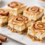 These bars bring together two favorites: the warm comfort of a cinnamon roll and the creamy richness of cheesecake. The base is buttery and spiced, the middle is silky and tangy, and the top gets a crackly caramelized sugar finish that’s irresistible. They’re simple enough for a casual weekend bake, but pretty enough for a special occasion.