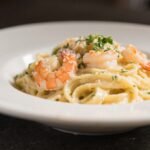 Close-up detail shot: golden-seared scallops and pink, just-curled shrimp nestled in a silky Alfredo