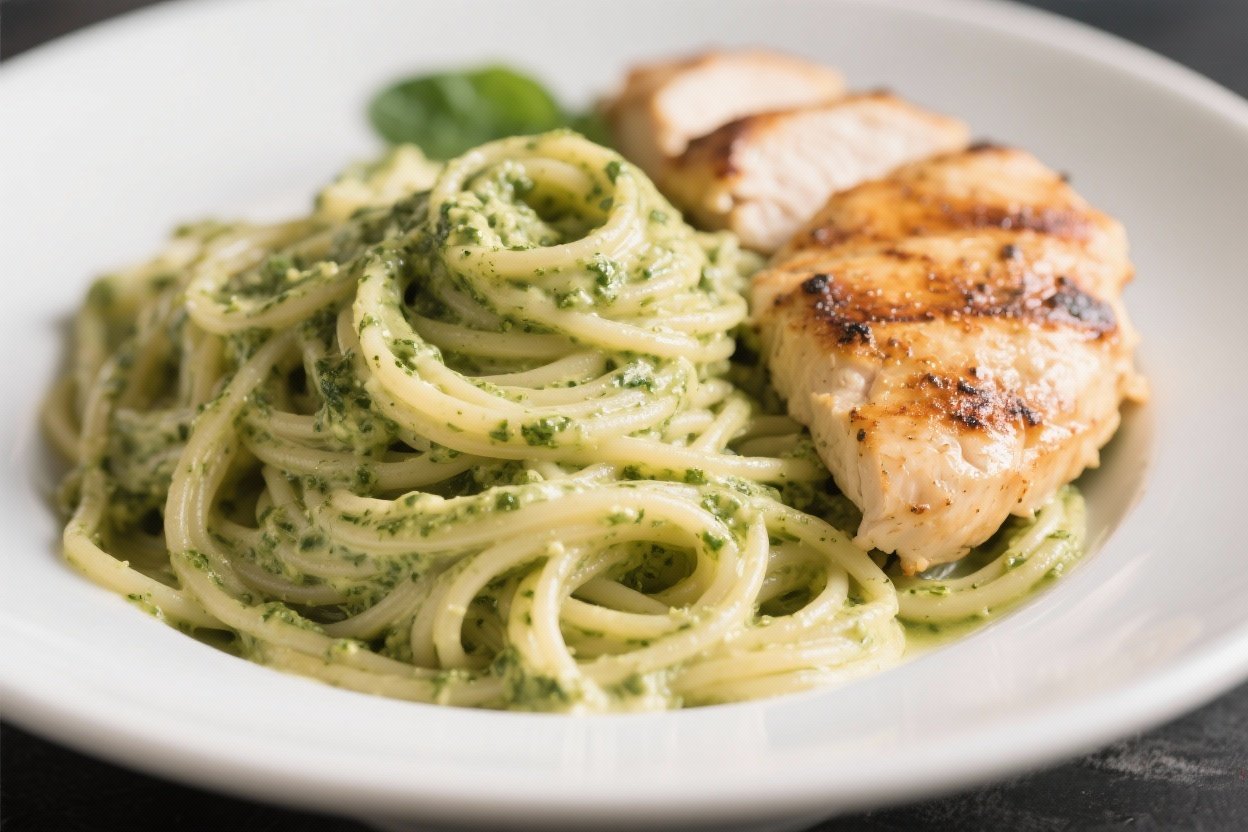 Spaghetti With Creamy Pesto Alfredo and Grilled Chicken - Comforting, Fresh, and Satisfying