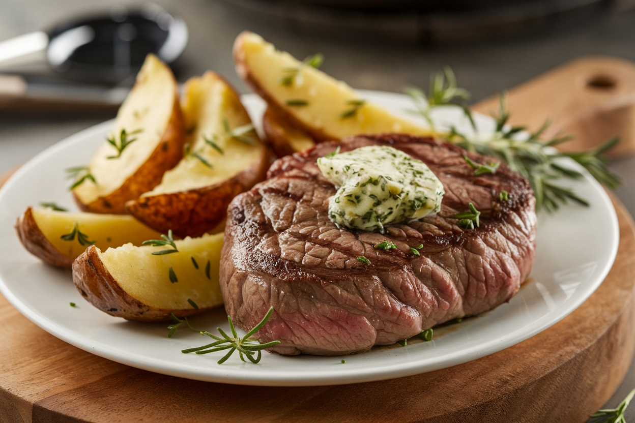 7. Serve Immediately: Slice the steak against the grain. Serve alongside the crispy potato wedges with an extra slice of that glorious herb butter melting on top.
